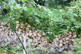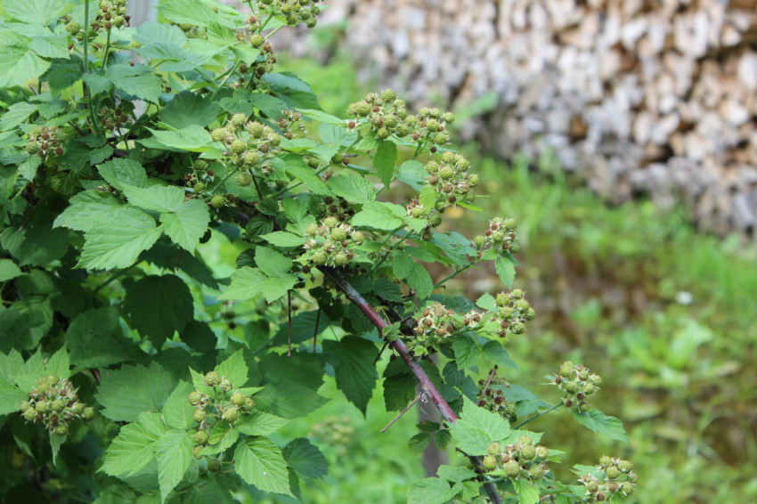 Ветка малины с зелёными ягодами на фоне поленницы дров в деревне в солнечный день лета