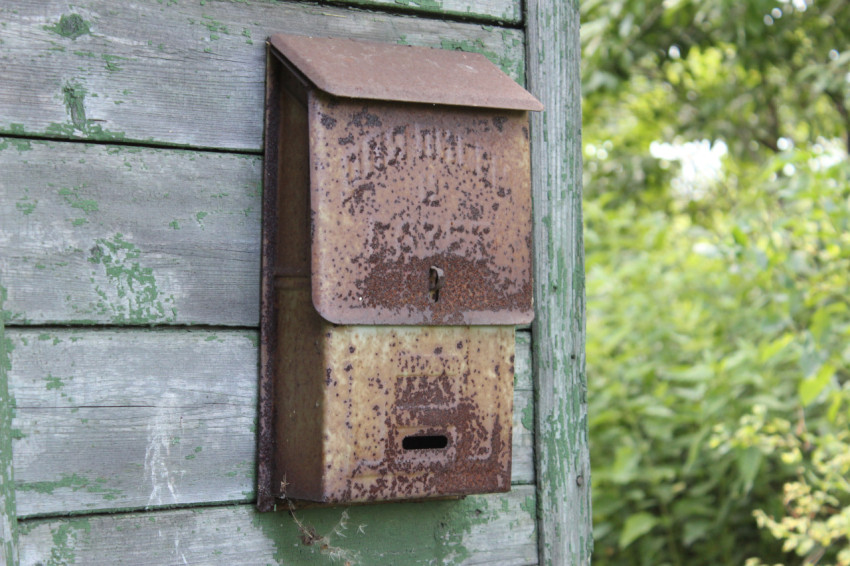 Старый поржавевший почтовый ящик на стене деревенского дома