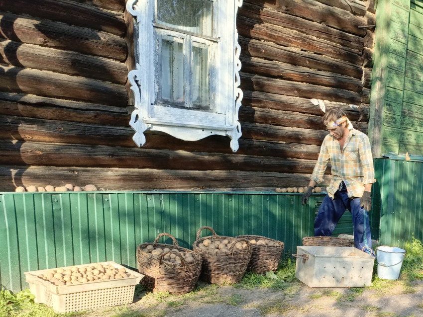 Мужчина в деревне около корзин с картофелем