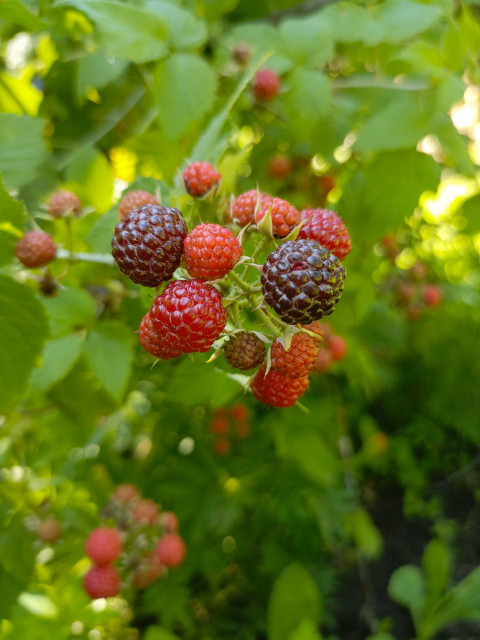 Ветка малины с зелёными ягодами на фоне поленницы дров в деревне в солнечный день лета