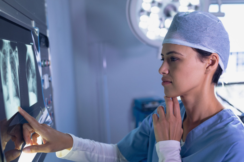 Девушка врач рассматривает рентгеновские снимки грудной клетки