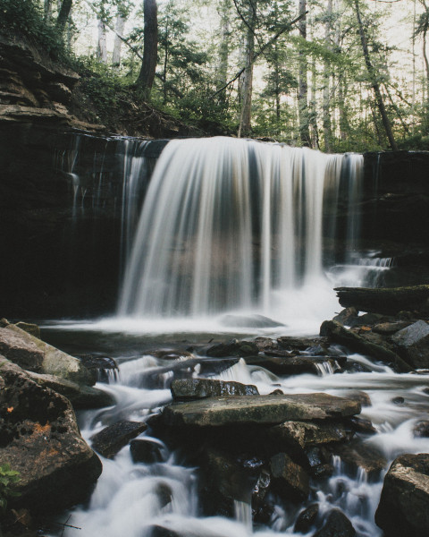 Два человека в желтых дождевиках держатся за руки и смотрят на водопад