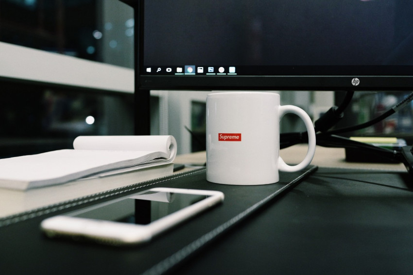 Белая кружка supreme на рабочем столе