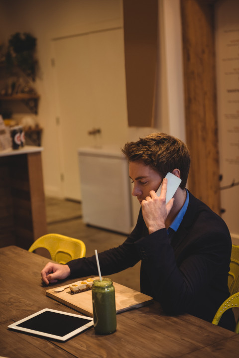 Мужчина в баре пьет бокал пива со смартфоном в руке