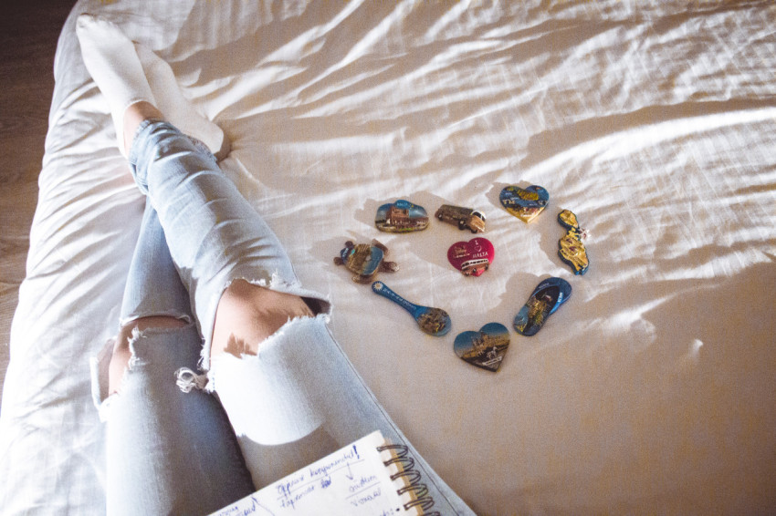 Магнитики из путешествий в виде сердца на белой постели и ноги
