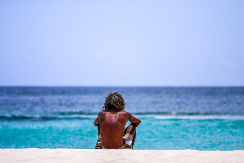 Блондинка с длинными волосами сидит облокотившись на дерево с ретро чемоданом