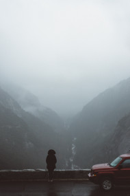 Девушка отсановилась на дороге полюбоваться горным пейзажем в тумане