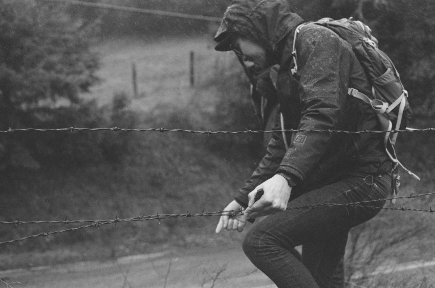 Человек с рюкзаком пролазит через забор из колючей проволоки