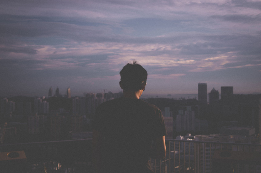 Парень на крыше дома с видом на город