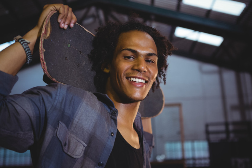 Парень со скейтбордом на плечах