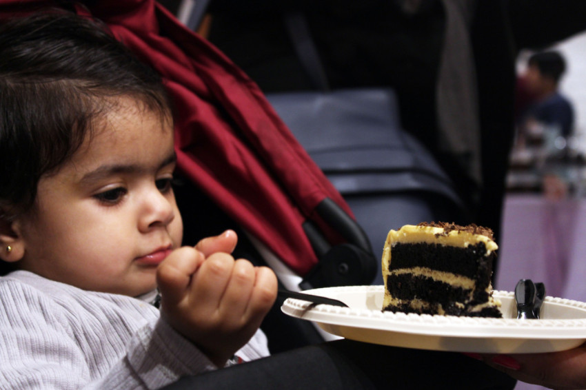 Ребенок ест кусок торта