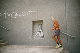 Девушка сидит под мостом на фоне реки города и проплывающего мимо прогулочного катера