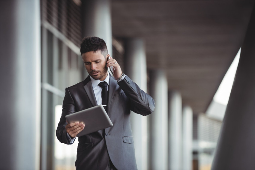Мужчина в деловом костюме говорит по смартфону и смотрит в планшет