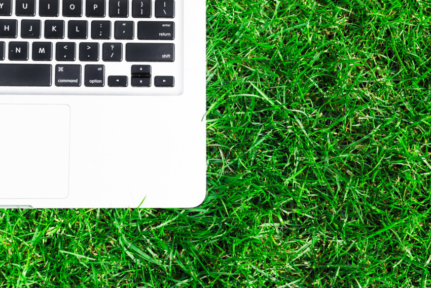 Край ноутбука на зеленой траве