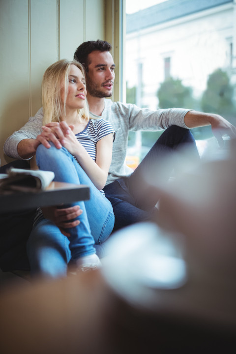 Красивая молодая пара сидят в обнимку в кафе