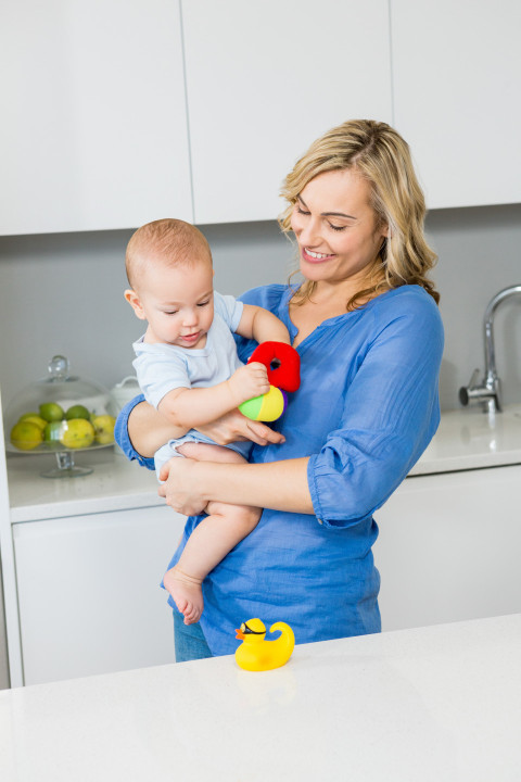 Молодая мама с сыном на руках на кухне