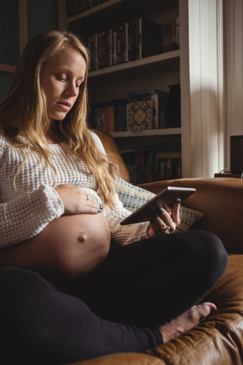 Беременная девушка на последнем месяце беременности сидит на диване дома с планшетом в руке