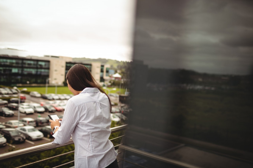 Девушка в офисной одежде на балконе со смартфоном в руках