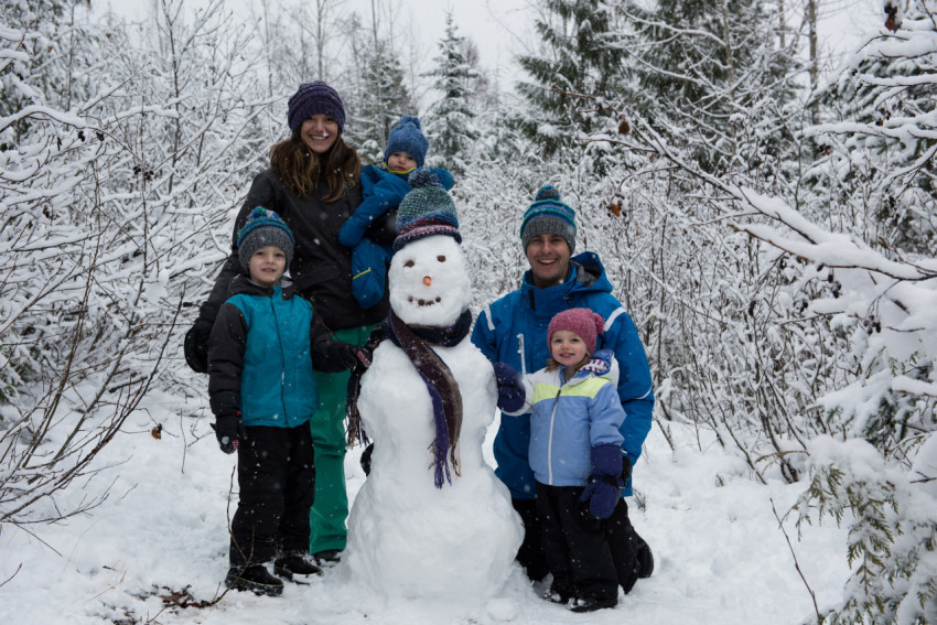Многодетная семья в лесу зимой вместе слепили снеговика