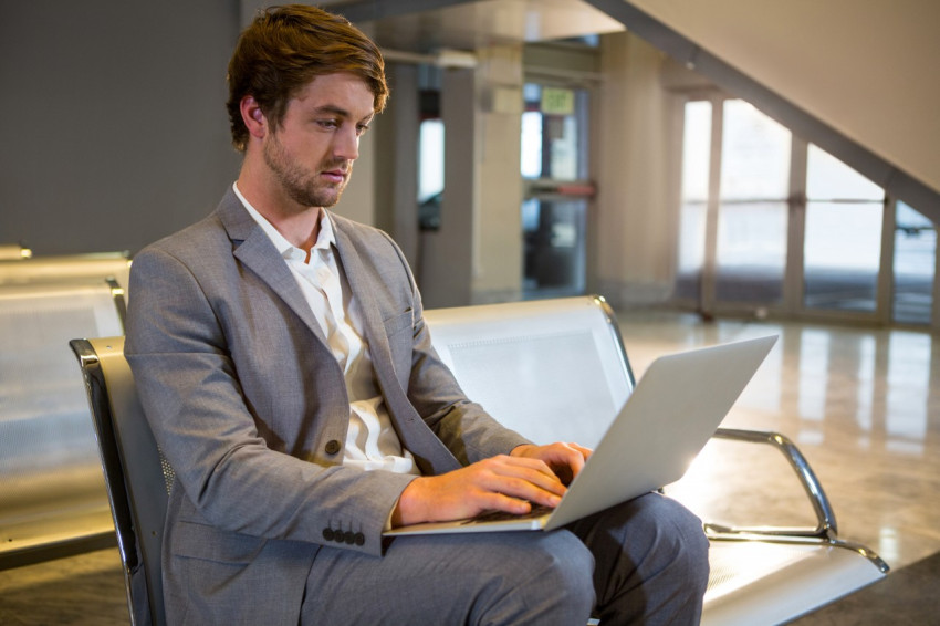 Мужчина работает за ноутбуком в зале ожидания аэропорта