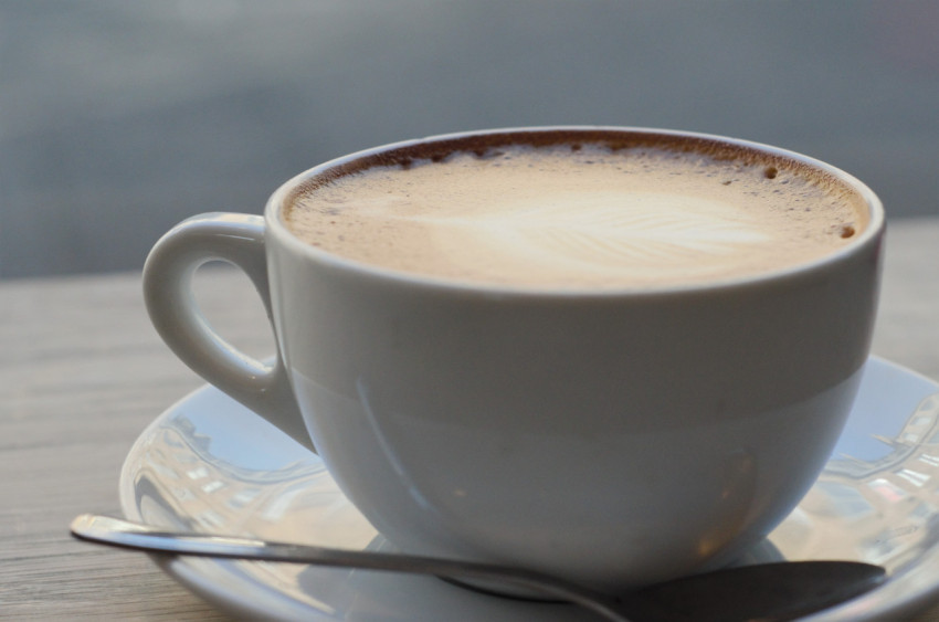 Чашка кофе, кофейные зерна и тетрадь на пружинке