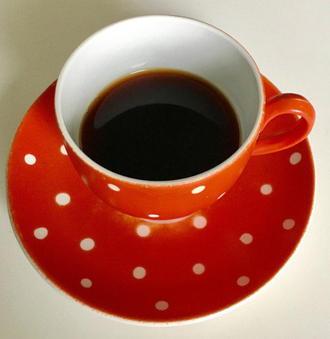 Красная чашка с кофе в горошек
