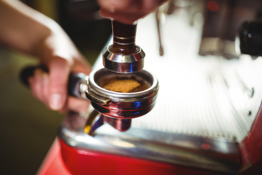 Чашка кофе на фоне с человеком со смартфоном в руках