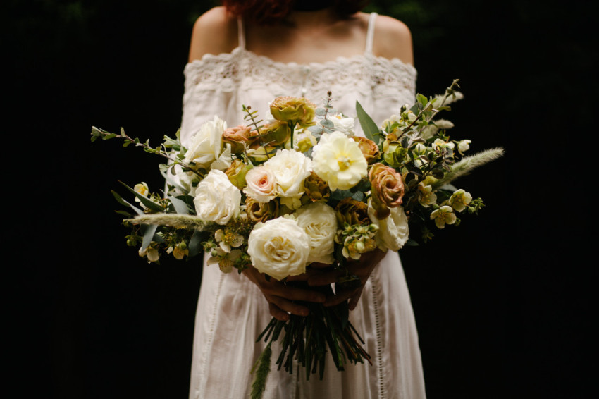 Невеста сидит с букетом невесты в руках