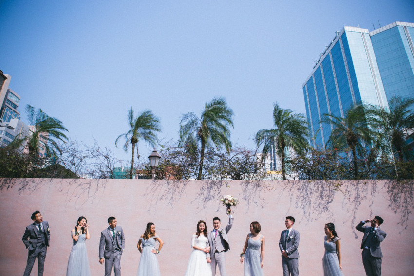 Жених и невеста с подружками невесты и друзьями жениха в одном стиле