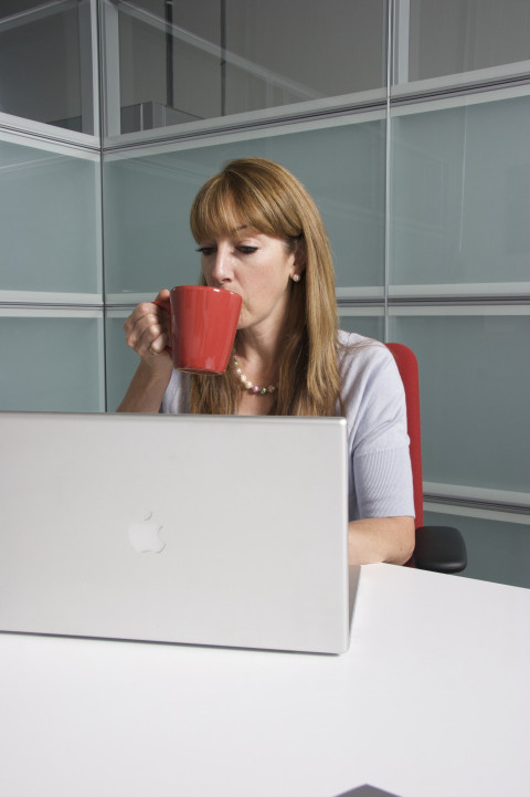 Женщина пьет кофе на ноутбуком в офисе на работе