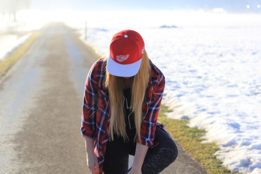 Девушка в красной кепке зимой