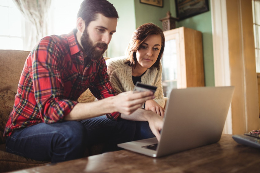 Молодая пара оплачивает покупку в интернете