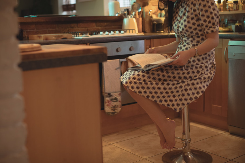 Девушка сидит на кухне на барном стуле с книгой в руках