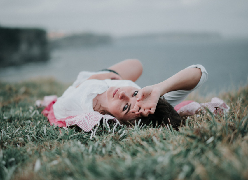 Девушка сидит на земле в темном лесу в солнечных лучах