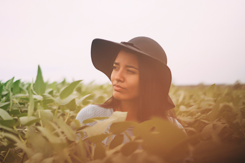 Девушка в шляпе в пол оборота в густой листве в поле