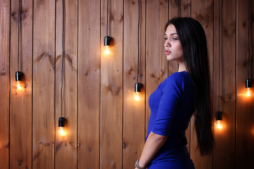 Девушка брюнетка в синем платье на фоне деревяннойц стены фотосессия