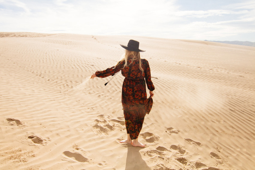 Девушка спиной в шляпе в пустыне с песком в руке следы на песке