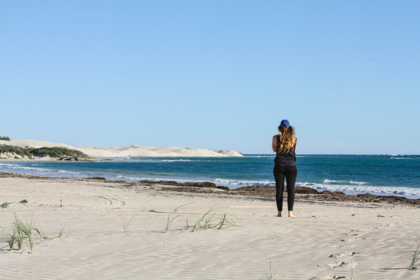 Счастливая пожилая пара на берегу моря вечером на закате солнца