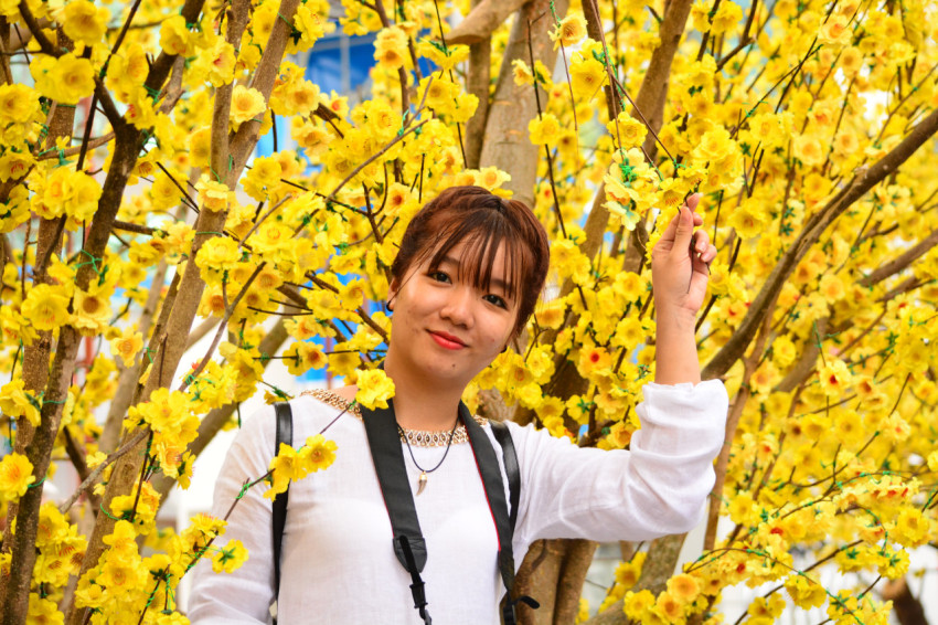 Девушка на фоне цветущей желтой форзиции