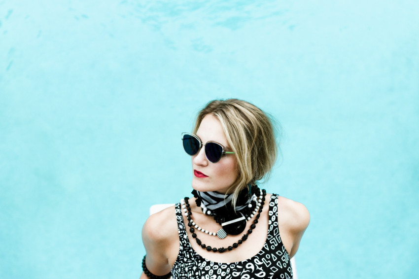 Девушка в черном платье сидит на спиленном дереве в лесу