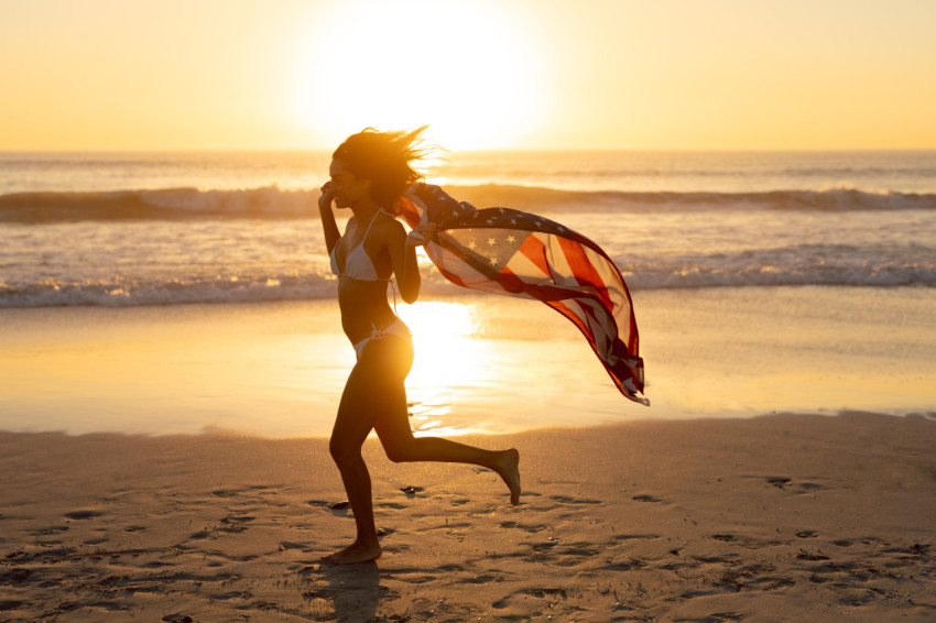 Девушка в купальнике бежит по пляжу на закате с американским флагом