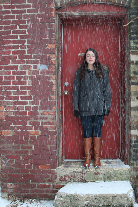 Девушка стоит с закрытыми глазами в дверном проеме на улице под снегом