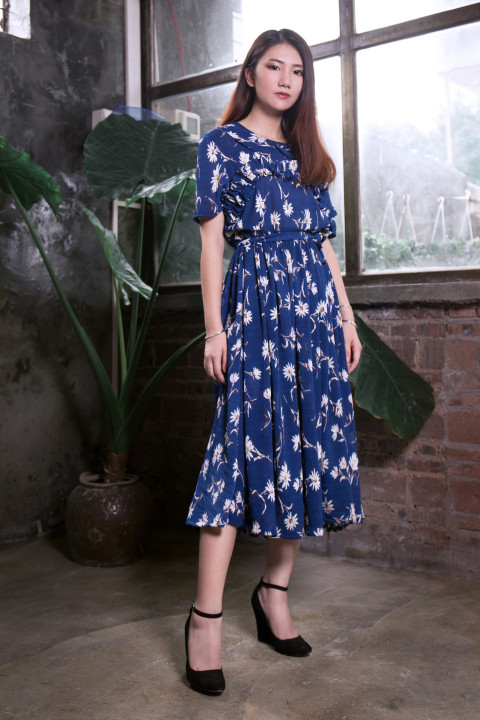 Красивая азиатская девушка в синем платье в цветочек