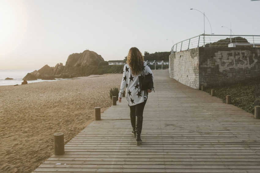 Девушка спиной на закате смотри вдаль на противоположный берег озера