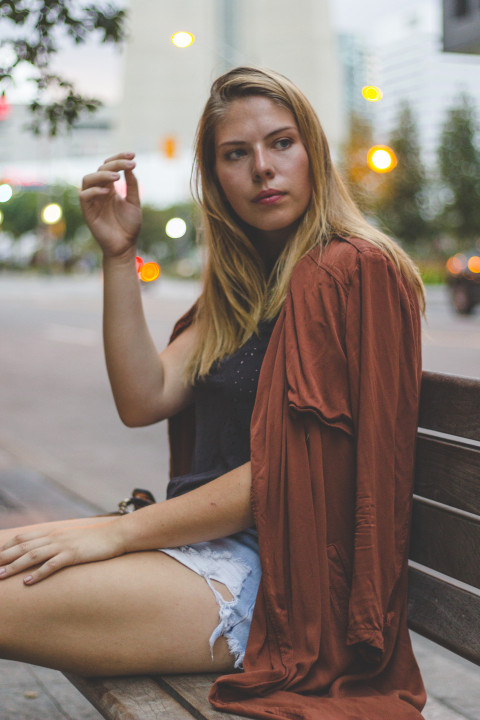 Девушка в коротких шортах сидит на скамейке