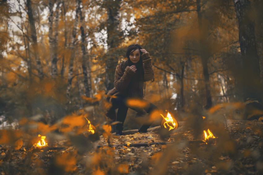 Фотосессия девушки с огнем в осеннем лесу