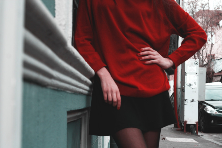 Девушка в красном свитере и короткой черной юбке