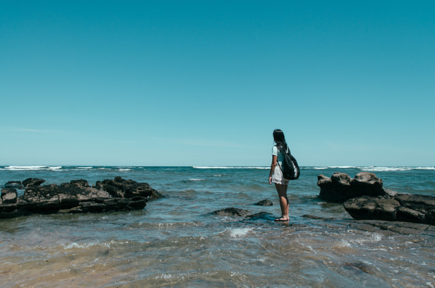 Девушка спиной с рюкзаком на спине на берегу океана стоит на камнях в воде и смотрит вдаль