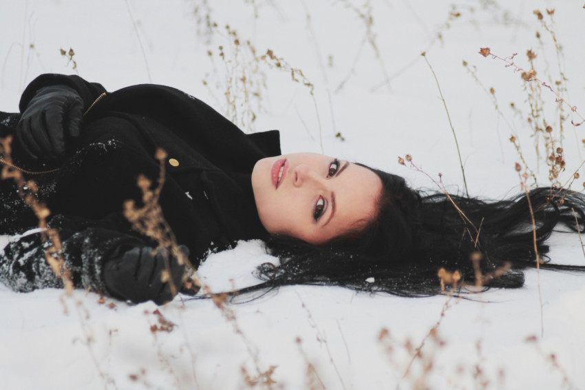 женщина люди девушка девушки people girl woman на снегу фотосессия в черном лежит зима брюнетка красиваяПохожие фото