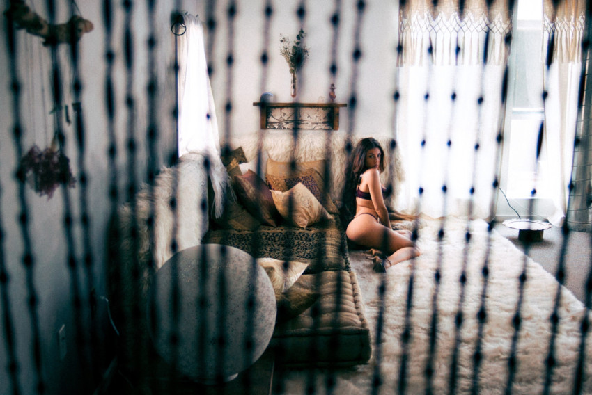 Девушка боком в бежевой шляпе с черной лентой смотрит на море
